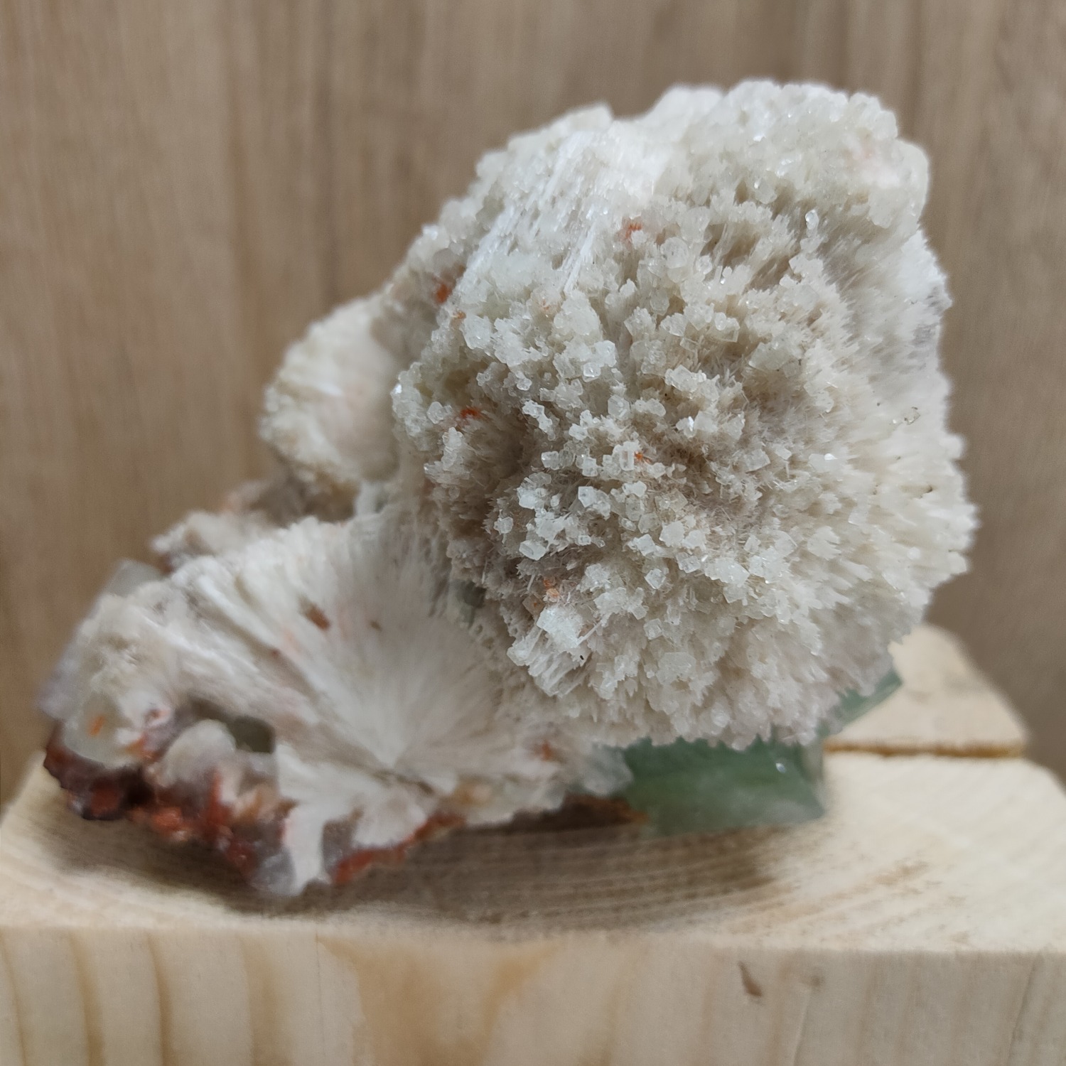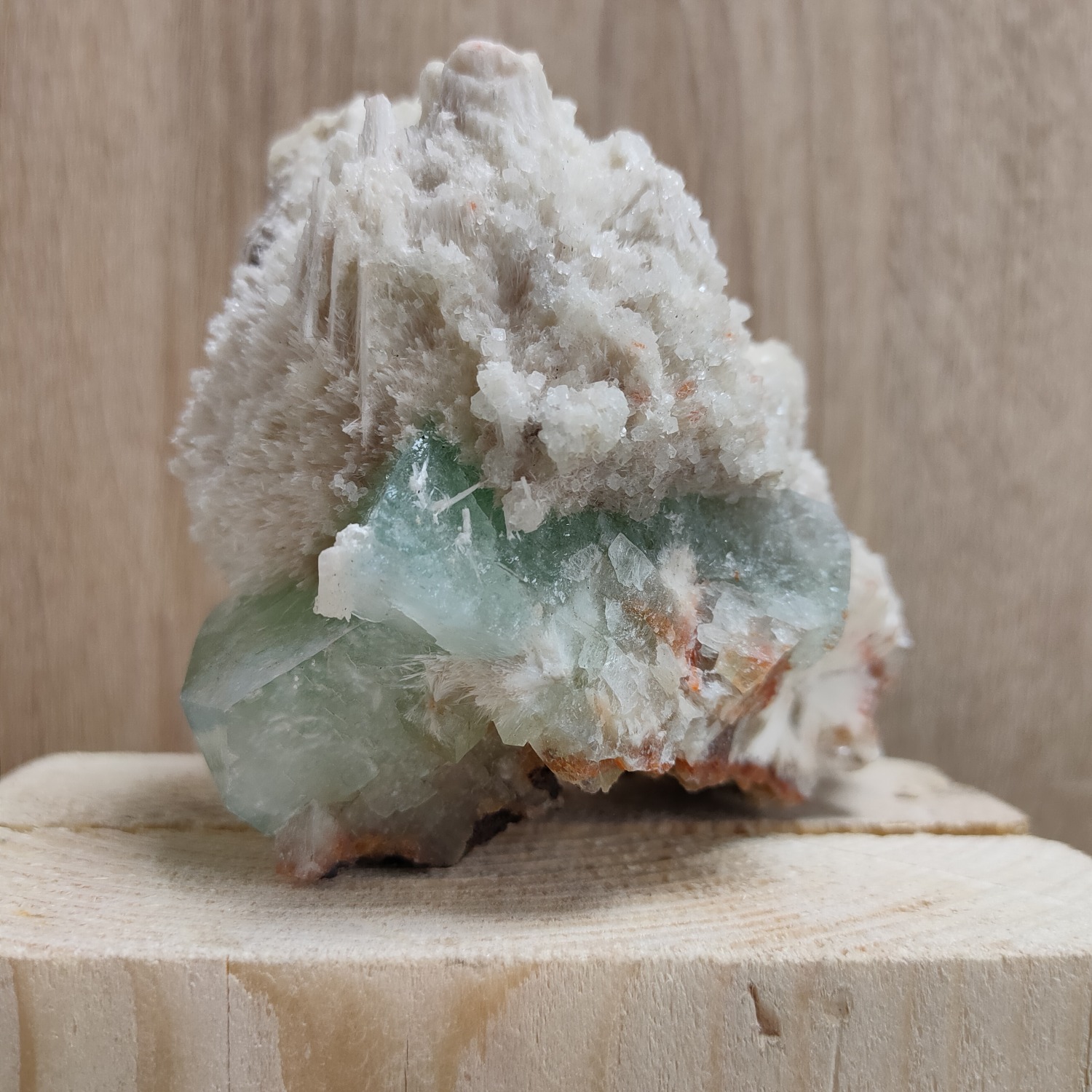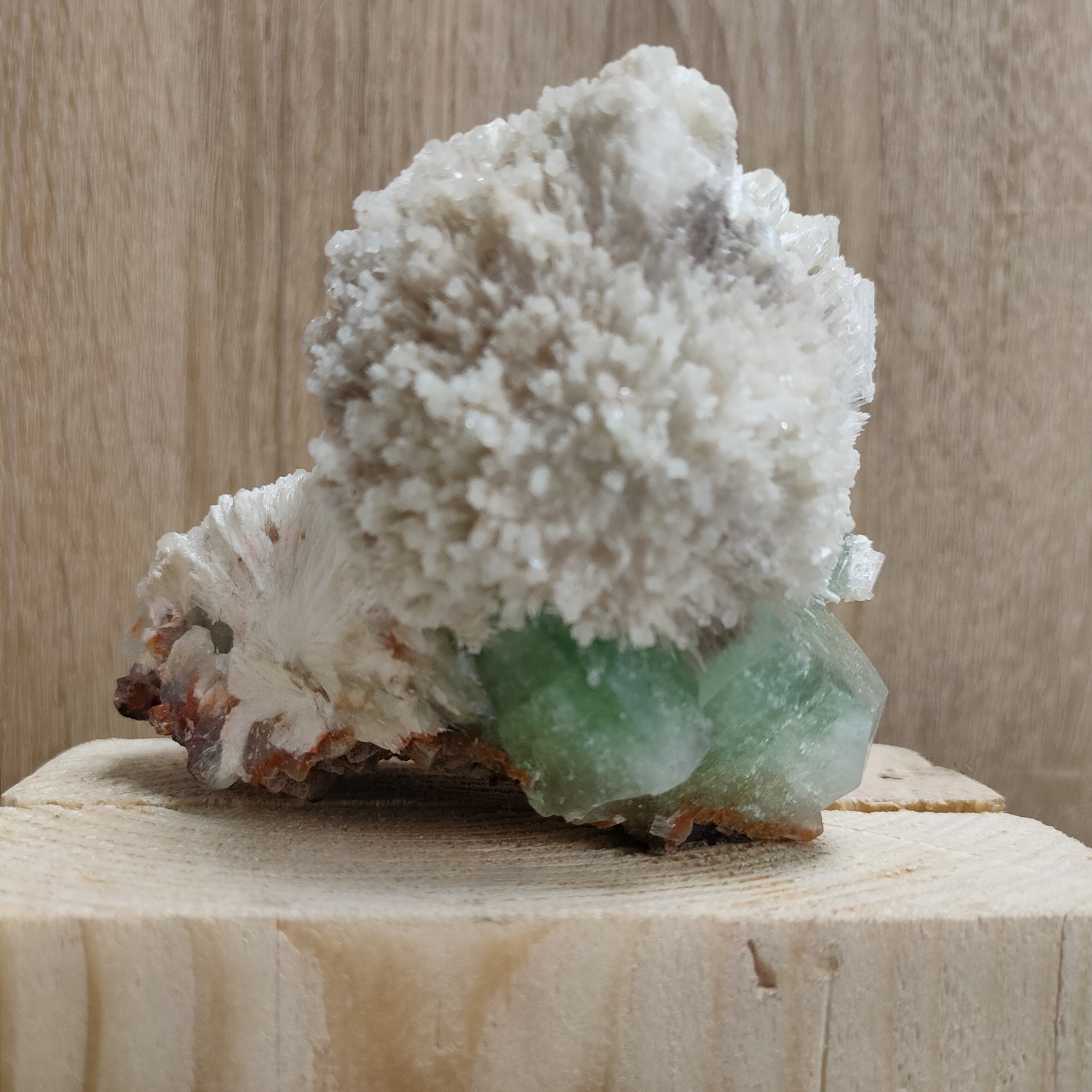 Větší krystaly zeleného apofylitu a stilbitu narůstají na krystalech Heulanditu, které tvoří podstavec 9 x 11 cm